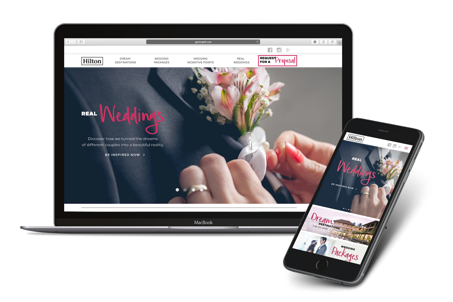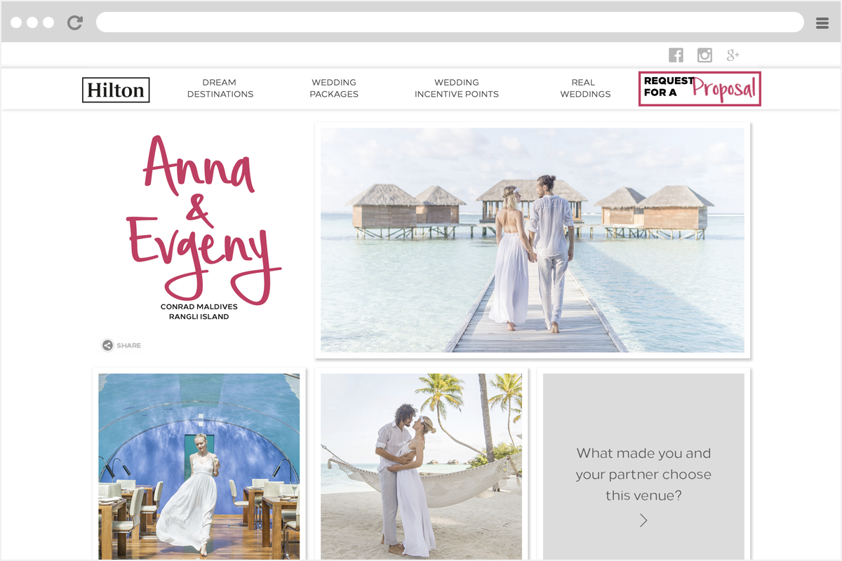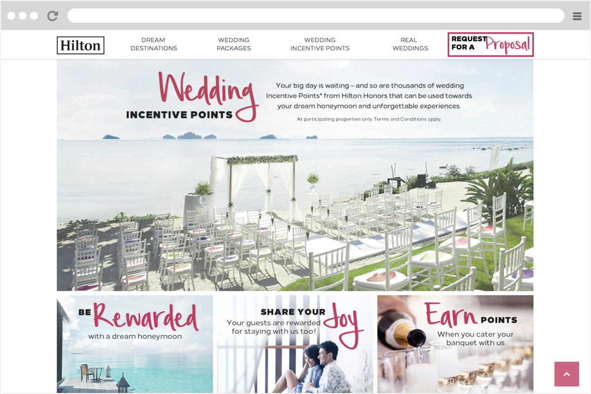 Hilton, the renowned international hospitality brand, presents a web portal designed to showcase their wedding venues and arrangements across various countries and outlets. The website features an introduction to the hotels, details on various wedding packages, couple testimonials, and an incentive points calculation for inquiry submissions.