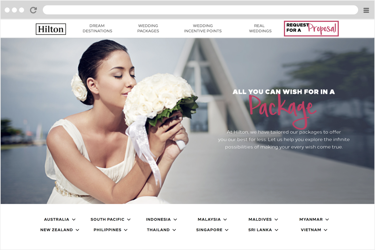 Hilton, the renowned international hospitality brand, presents a web portal designed to showcase their wedding venues and arrangements across various countries and outlets. The website features an introduction to the hotels, details on various wedding packages, couple testimonials, and an incentive points calculation for inquiry submissions.